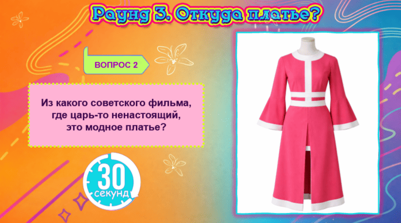 В этом раунде участницам предстоить назвать фильм по известному платью из него.