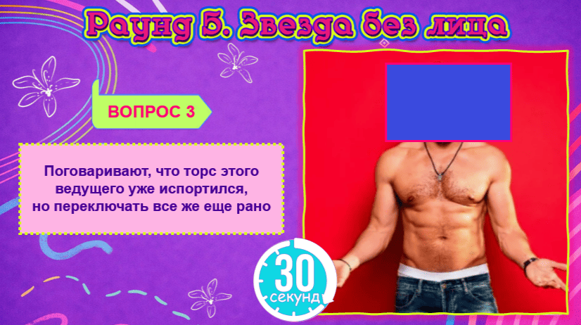 Пикантный раунд, в котором прекрасной половине человечества нужно будет угадать знаменитость по торсу.