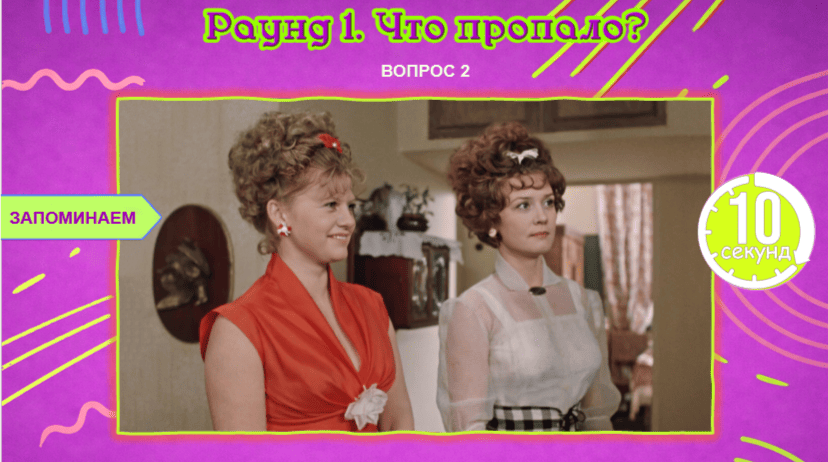 Первый раунд — идеальный разогрев для команды. Участникам показывают картинку, которую они должны запомнить. Потом ведущий переключает следующий слайд и участники ищут, что пропало.